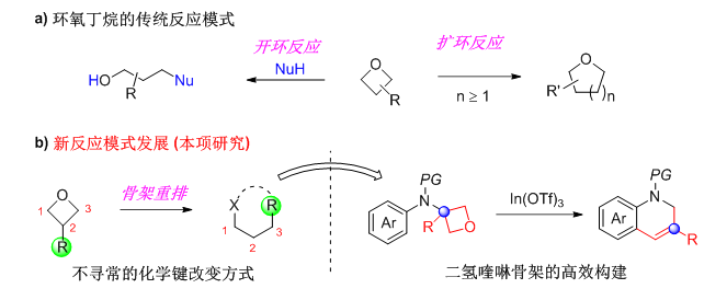 最近我校石油化工學(xué)院新引進的青年教師黃海博士與孫建偉教授在Angew. Chem. Int. Ed.上共同發(fā)表題為“Unusual Skeletal Reorganization of Oxetanes for the Synthesis of 1,2-Dihydroquinolines”的研究論文。骨架重排是有機化學(xué)中重要且有趣的反應(yīng)模式,它能夠構(gòu)建出很多復(fù)雜但實用價值很高的有機分子骨架。因此,探索特殊官能團骨架重排反應(yīng),揭示其反應(yīng)規(guī)律是有機合成中重要的研究方向。本論文實現(xiàn)了一種關(guān)于環(huán)氧丁烷特殊骨架重排反應(yīng),這是繼環(huán)氧丁烷傳統(tǒng)開環(huán)和擴環(huán)反應(yīng)方式上的一次全新的反應(yīng)模式突破。通過本骨架重排策略,能夠高效快速的構(gòu)建二氫喹啉骨架。后期應(yīng)用顯示,目標分子具有很高的合成價值,是一類不可或缺的骨架結(jié)構(gòu)。