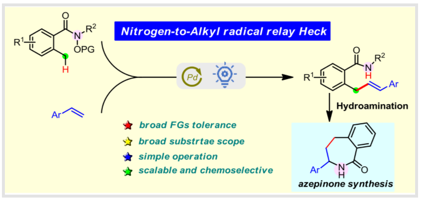 Sheng, Xiaxin.; Du, Yujia.; Li, Junhua.; Teng, Qiaoqiao.*; and Chen, Ming.*Photo-induced Nitrogen-to-Alkyl Radical Relay Heck Reaction of o-Alkylbenzamide with Vinyl Arenes by Palladium Catalysis. Org. Lett.2023, 25, 3664-3669.
