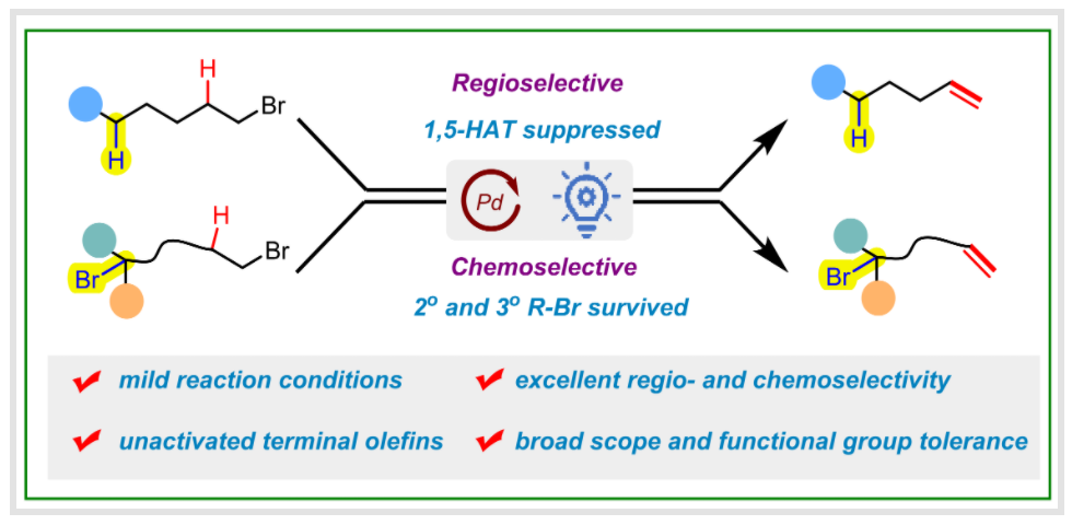 Yang, Sen.; Hu, Hao.; and Chen, Ming.* Photoinduced Palladium-Catalyzed Regio- and Chemoselective Elimination of Primary Alkyl Bromides: A Mild Route to Synthesize Unactivated Terminal Olefins.Org. Lett. 2023, 25, 7968-7973.