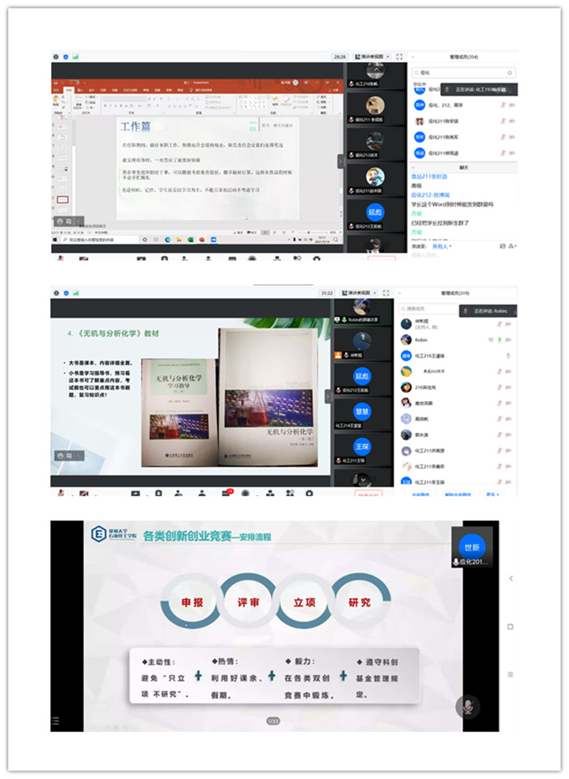 2021級本科新生入學教育由思想引領與價值塑造教育、校情概況與專業(yè)素養(yǎng)教育、入學適應與行為養(yǎng)成教育、學生安全與心理健康教育、政策解讀與文明規(guī)范教育五大模塊組成,內容包含校史校情教育、黨團知識教育、專業(yè)導航教育、安全教育等十三項教育內容。針對疫情防控形勢下新生延期開學的情況,學院全面開展新生線上入學教育,通過在線課程、線上專題會議等形式面向全體新生展開。學院進行針對學院具體實際來開展學院、專業(yè)介紹、專業(yè)思想教育、學生適應性教育、班主任開班會、在線干部競選、學院社團線上交流會等,使新生對大學生活與學習有全面了解。全體新同學認真參加線上入學教育,以飽滿熱情迎接大學新生活。