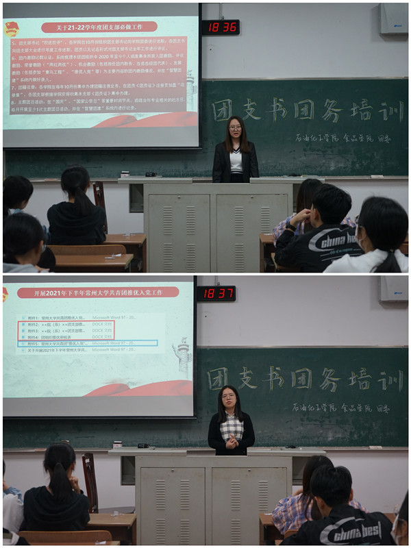 院團(tuán)委書記孫潘老師從思想建設(shè)方面講述了共青團(tuán)工作的重要性,指出各團(tuán)支部應(yīng)從信仰公開(kāi)課入手加強(qiáng)團(tuán)員思想教育,做好團(tuán)員發(fā)展與后續(xù)教育工作,加強(qiáng)團(tuán)支部建設(shè),提升團(tuán)支部凝聚力。副書記許涵僑同學(xué)對(duì)“雙述雙評(píng)”、“團(tuán)日活動(dòng)”、“黨史學(xué)習(xí)會(huì)”的開(kāi)展進(jìn)行了具體培訓(xùn),并對(duì)下半年推優(yōu)工作進(jìn)行了具體布置。