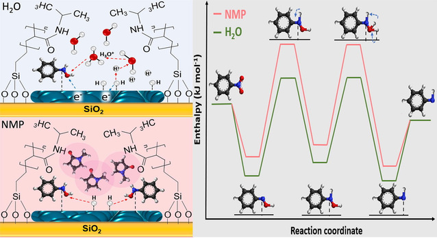 在前期研究聚合物對催化劑誘導(dǎo)的溶劑化效應(yīng)的基礎(chǔ)上(ACS Catalysis 2023, 13, 10, 6590–6602,Top期刊,封面論文),中文解析見:https://mp.weixin.qq.com/s/6ZsBwg6RtE0h1wOAPhf3_w,黃鵬程博士與荷蘭特文特大學(xué)(University of Twente)Leon Lefferts, Jimmy Faria Albanese 教授合作,研究了液相加氫反應(yīng)中溶劑(質(zhì)子溶劑與非質(zhì)子溶劑)對于修飾催化劑表面的聚合物的刺激響應(yīng)性的影響,以及對于硝基苯加氫反應(yīng)的反應(yīng)速率,反應(yīng)活化能,過渡態(tài)能量的影響。