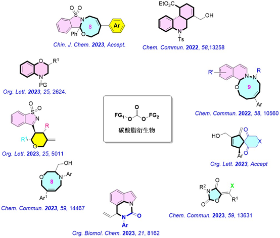 碳酸酯作為一類重要的有機(jī)合成砌塊,在有機(jī)雜環(huán)化合物合成領(lǐng)域具有重要的戰(zhàn)略意義,為很多重要的雜環(huán)化合物分子提供了高效的合成方法。近兩年,孫建偉和黃海團(tuán)隊(duì)圍繞核心分子骨架高效構(gòu)建,針對(duì)于碳酸酯類衍生物開(kāi)展了系列的精準(zhǔn)轉(zhuǎn)化研究,包括:對(duì)映選擇性環(huán)加成反應(yīng)、可控性分子內(nèi)環(huán)合反應(yīng)、連續(xù)多環(huán)化反應(yīng)等轉(zhuǎn)化類型,為包括中環(huán)化合物等在內(nèi)的10余種重要雜環(huán)化合物提供的高效構(gòu)建策略。相關(guān)成果發(fā)表在Org. Lett.; Chem. Commun.; Chin. J. Chem.等知名期刊上。