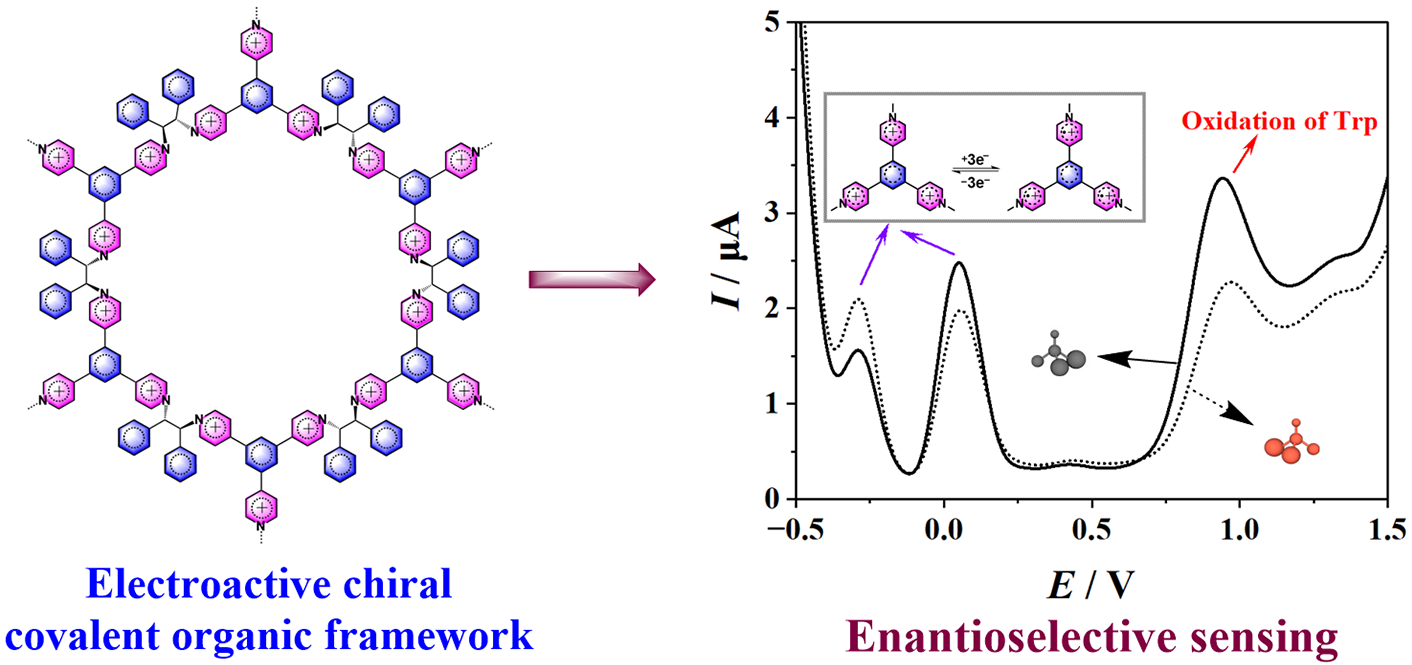 利用吡啶鎓離子有一定電化學(xué)響應(yīng)的特點(diǎn),該研究小組嘗試制備了具有電化學(xué)活性的手性共價(jià)有機(jī)框架材料實(shí)現(xiàn)對(duì)氨基酸和氨基醇分子的手性識(shí)別(Anal. Chem.2024, 96, 3200?3207)。此外,該研究小組也報(bào)道了一系列二茂鐵基參與的基于靜電吸引和π-π+作用的手性傳感器(Anal. Chem.2020, 92, 13711?13717;Anal. Chem.2021, 93, 10160?10166;Anal. Chem.2022, 94, 6050?6056)。