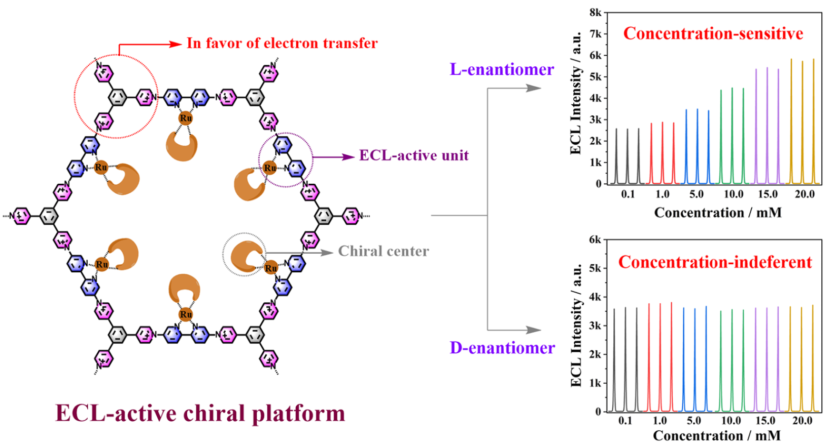 具有優(yōu)異光電性能的手性材料在對(duì)映體識(shí)別中有著極大地應(yīng)用潛力。近年來(lái),孔泳教授團(tuán)隊(duì)的吳大同副教授基于離子型手性分子構(gòu)建了一系列具有電化學(xué)、電致化學(xué)發(fā)光、圓二色譜以及熒光光譜等響應(yīng)的手性識(shí)別載體: