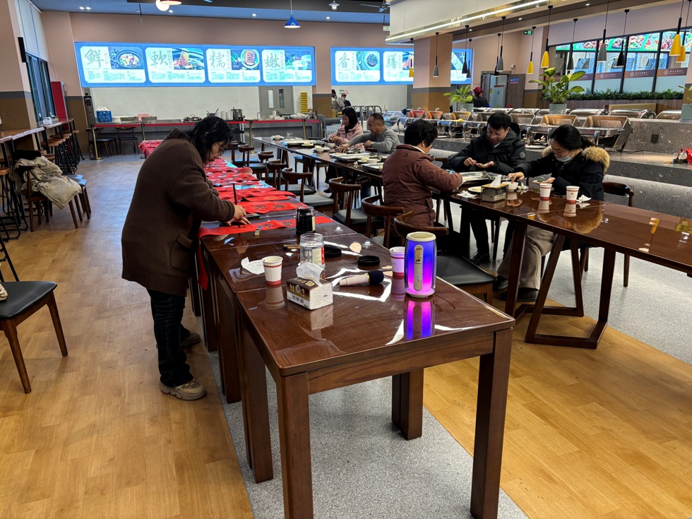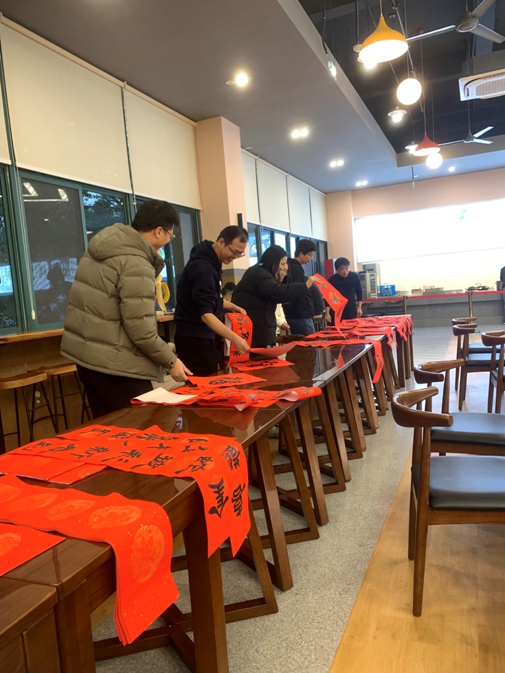 活動(dòng)現(xiàn)場(chǎng),董燕敏老師為在場(chǎng)教職工現(xiàn)場(chǎng)寫(xiě)春聯(lián)、送“?!弊郑环鶟鉂饽晡兜南矐c“春聯(lián)”和“?!弊郑€未晾干,就被熱情的職工們“一搶而空”。