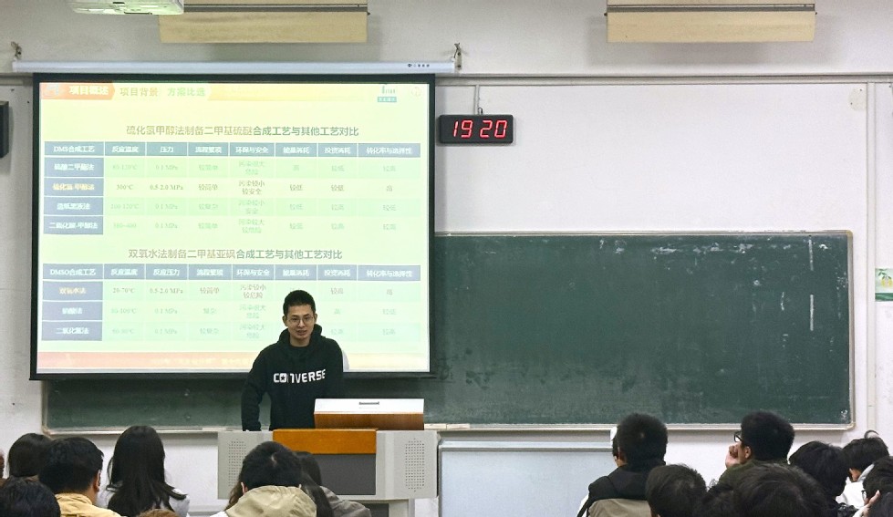 為幫助同學(xué)們拓寬專業(yè)視野、提升專業(yè)實(shí)踐能力,11月11日晚,“石化青年說(shuō)”系列講座第二講在W1207教室順利舉行,講座由化工224班常佩源與化工226班張皓博兩位同學(xué)擔(dān)任主講。他們所在的常州大學(xué)“砜硫隊(duì)”,曾憑借“福建凱美特氣體有限公司分公司年產(chǎn)1.5萬(wàn)噸二甲基亞砜項(xiàng)目”的出色設(shè)計(jì),在2025年“天正設(shè)計(jì)杯”第十九屆全國(guó)大學(xué)生化工設(shè)計(jì)競(jìng)賽中脫穎而出,斬獲全國(guó)特等獎(jiǎng)。