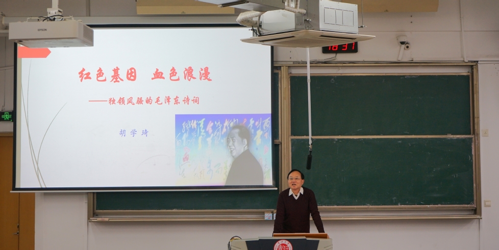 胡學(xué)琦以毛澤東詩詞為線索,從毛澤東與詩詞、革命歷程、精神心路與美學(xué)特征四方面展開,生動解讀詩詞背后的黨史與革命情懷;他帶領(lǐng)同學(xué)們回顧從“誰主沉浮”的豪情到“星火燎原”的膽識,展現(xiàn)了毛澤東詩詞作為“詩化黨史”的深刻內(nèi)涵,并剖析其中蘊含的崇高精神與人文哲思。講座尾聲,胡學(xué)琦引用“數(shù)風(fēng)流人物,還看今朝”,鼓勵同學(xué)們傳承紅色精神,勇?lián)鷷r代使命。