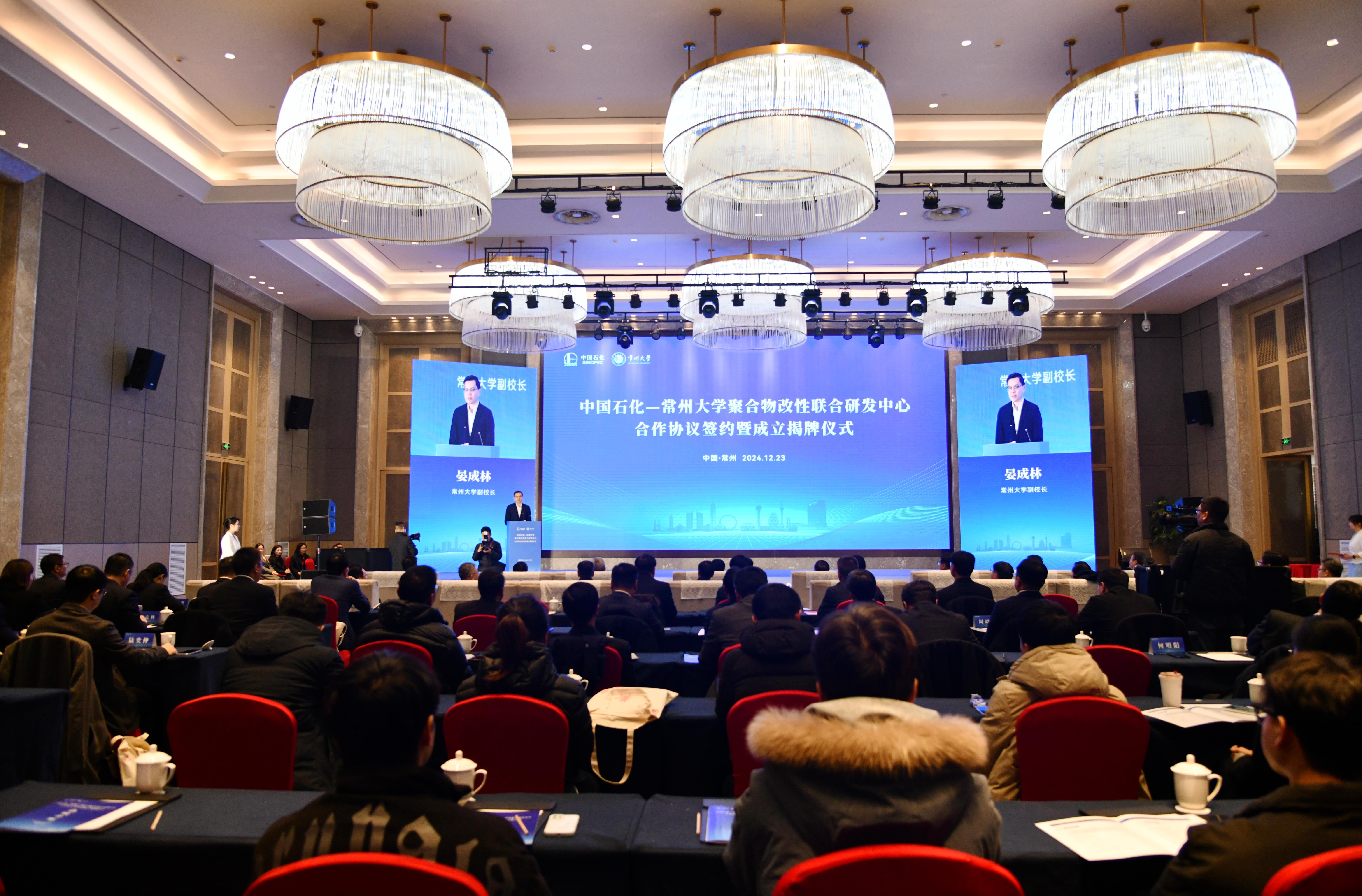 12月23日,中國石化—常州大學(xué)聚合物改性聯(lián)合研發(fā)中心(簡稱“聯(lián)合研發(fā)中心”)合作協(xié)議簽約暨成立揭牌儀式在常州舉行。中國工程院院士謝克昌,中國石油化工集團有限公司黨組成員、副總經(jīng)理、股份公司高級副總裁李永林,科技部總經(jīng)理卞鳳鳴,綜合管理部副主任、黨組辦公室副主任鐘文標,化工事業(yè)部副總經(jīng)理王立東,化工銷售江蘇分公司總經(jīng)理李楚新,揚子石化副總經(jīng)理劉文豹,化工銷售公司副總經(jīng)理錢斌,北京化工研究院副院長高達利,科技部集團首席專家莊毅等相關(guān)領(lǐng)導(dǎo),常州市人民政府副市長蔣鵬舉,武進區(qū)委常委、常州西太湖科技產(chǎn)業(yè)園黨工委書記徐俊,常州大學(xué)黨委副書記、校長陳海群,原黨委書記陳群,黨委常委、副校長李忠玉,黨委常委、副校長彭明國,黨委常委、副校長李亞飛,副校長晏成林出席會議,常州大學(xué)相關(guān)部門、學(xué)院負責人及教師代表參加會議。晏成林主持會議。 晏成林主持會議