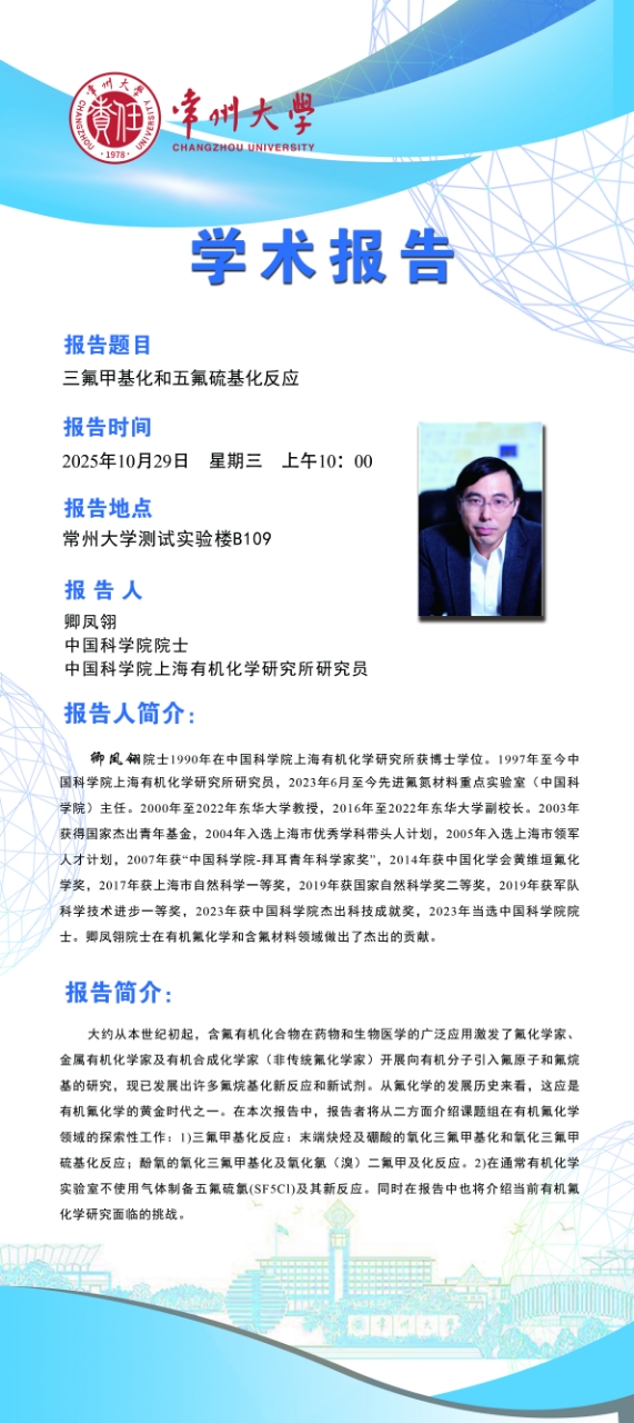 【學術(shù)報告】10月29日自然與合成有機化學研究院學術(shù)報告——卿鳳翎院士 中國科學院
