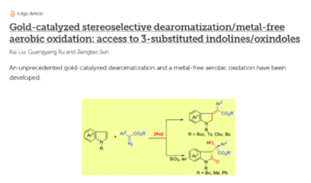 近日,石油化工學(xué)院孫江濤教授課題組在化學(xué)頂級(jí)期刊《Chemical Science》上發(fā)表題為“Gold-catalyzed stereoselective dearomatization/metal-free aerobic oxidation: access to 3-substituted indolines/oxindoles”的通訊文章,這是我校在此期刊上發(fā)表的第一篇通訊論文。Chemical Science是英國(guó)皇家化學(xué)會(huì)(the Royal Society of Chemistry)的旗艦期刊,報(bào)道化學(xué)學(xué)科原創(chuàng)性研究成果,是化學(xué)綜合領(lǐng)域最有影響力的三大期刊之一,也是國(guó)際上衡量科研小組研究水平的重要標(biāo)志性期刊。