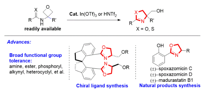 A Mild Catalytic Synthesis of 2-Oxazolines via Oxetane Ring-Opening: Rapid Access to A Diverse Family of Natural Products Hai Huang,Wen Yang,Zuliang Chen,Zengwei Laiand Jianwei Sun* 近日,孫建偉和黃海教師課題組在化學(xué)國際頂級刊物Chemical Science上發(fā)表題為“A Mild Catalytic Synthesis of 2-Oxazolines via Oxetane Ring-Opening: Rapid Access to A Diverse Family of Natural Products”的研究論文。論文通訊聯(lián)系人為孫建偉教授,第一作者為石油化工學(xué)院新進(jìn)青年教師黃海博士。噁唑啉類化合物在生物活性分子以及金屬配體中都有廣泛的應(yīng)用。關(guān)于該類化合物的合成目前只能依賴于非催化地胺基醇或者N-烯丙基甲酰胺類化合物的環(huán)合反應(yīng)。該工作巧妙地將甲酰胺鍵引入到氧雜環(huán)丁烷分子中從而實(shí)現(xiàn)其分子內(nèi)開環(huán)反應(yīng)。該方法發(fā)展了一種催化合成噁唑啉環(huán)的方法,同時(shí)兼具條件溫和、高效性、優(yōu)越的官能團(tuán)容忍性等優(yōu)點(diǎn)。通過該方法不僅能夠?qū)崿F(xiàn)新型手性配體地合成,同時(shí)能夠快速地合成系列天然產(chǎn)物包括(±)-Spoxazomicin C, (±)-Madurastatin B1和(±)-Spoxazomicin D。 Chemical Science是是英國皇家化學(xué)會(RSC)旗艦刊物,2019年影響因子為9.556。中科院分區(qū)為一區(qū),TOP及Nature Index刊物。該期刊發(fā)表綜合化學(xué)領(lǐng)域的高水平論文,致力于為化學(xué)領(lǐng)域研究人員的學(xué)術(shù)觀點(diǎn)和學(xué)術(shù)信息交流提供一個(gè)國際化、高質(zhì)量的學(xué)術(shù)交流期刊平臺。