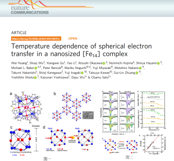 近日,我校石油化工學(xué)院吳大雨教授團(tuán)隊(duì)在合成和表征新型無(wú)機(jī)納米團(tuán)簇及其電子行為研究方面取得重要進(jìn)展,在Nature Communications(自然通訊)發(fā)表了題為“Temperature dependence of spherical electron transfer in a nanosized [Fe14] complex”(DOI: 10.1038/s41467-019-13279-y)的原創(chuàng)性論文(文章鏈接:https://www.nature.com/articles/s41467-019-13279-y)。Nature Communications期刊是Nature出版集團(tuán)旗下的國(guó)際頂級(jí)綜合性學(xué)術(shù)期刊,該項(xiàng)成果以常州大學(xué)為第一署名單位。近年來(lái),吳大雨教授課題組致力于分子基材料跨學(xué)科研究,所涉及的學(xué)科方向包括化學(xué)、材料學(xué)、物理學(xué)與光電子等。該項(xiàng)工作應(yīng)用金屬-有機(jī)自組裝策略,合成了高核鐵原子納米團(tuán)簇,通過(guò)精準(zhǔn)調(diào)控團(tuán)簇表面的自由電子觀察分子水平上多電子轉(zhuǎn)移,顯示出分子基材料在電子轉(zhuǎn)移活性催化材料、單分子磁體、高密度信息存儲(chǔ)等領(lǐng)域的巨大應(yīng)用潛力。其亮點(diǎn)不僅在于成功合成氰橋高核鐵納米團(tuán)簇,同時(shí)結(jié)合多種表征方法和理論計(jì)算清晰表征團(tuán)簇球殼表面的電子轉(zhuǎn)移活性位點(diǎn),其作為電子化合物屬性是一類具有特殊性能的量子材料,其中過(guò)剩電子被限域在團(tuán)簇殼層表面并充當(dāng)陰離子,對(duì)電子傳輸和材料的催化、電磁等性能起關(guān)鍵作用。