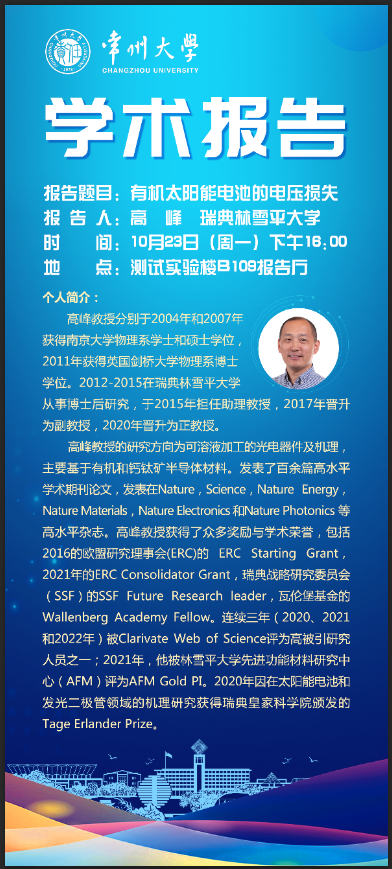 | 【學(xué)術(shù)報(bào)告】10月23日學(xué)術(shù)報(bào)告——高峰教授,瑞典林雪平大學(xué) |